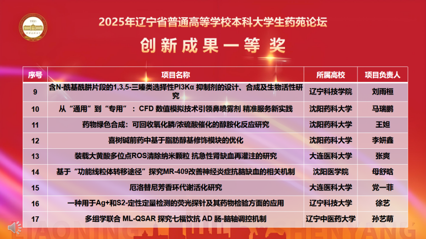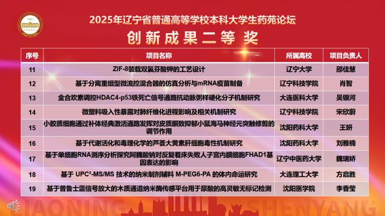 11月7日,由辽宁省教育厅主办、beat365平台官方网站承办的“2025年辽宁省普通高等学校本科大学生药苑论坛”在南校区图书馆国为报告厅举行。本次论坛吸引了来自大连理工大学、辽宁大学、大连医科大学等15所兄弟院校的500余名师生参赛,充分彰显了辽宁药学教育领域的蓬勃活力与深厚底蕴。山东大学、大连理工大学、辽宁大学、大连医科大学、beat365平台官方网站、辽宁中医药大学、沈阳医学院的专家出席论坛并对参赛项目进行现场评审。
