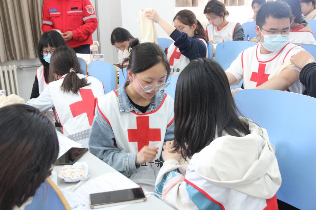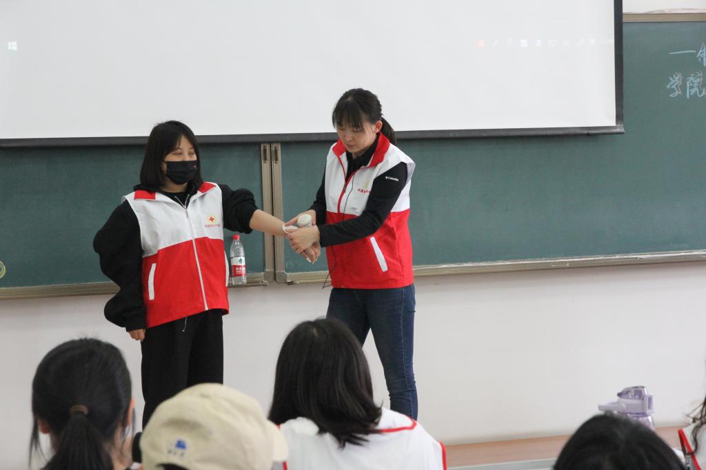 除翟老师给同学们示范讲授的心肺复苏之外,翟老师还与红会其他老师为我们演示了止血包扎、手臂及关节等部位的包扎方法,并让同学们两两组队跟着老师一同操作。