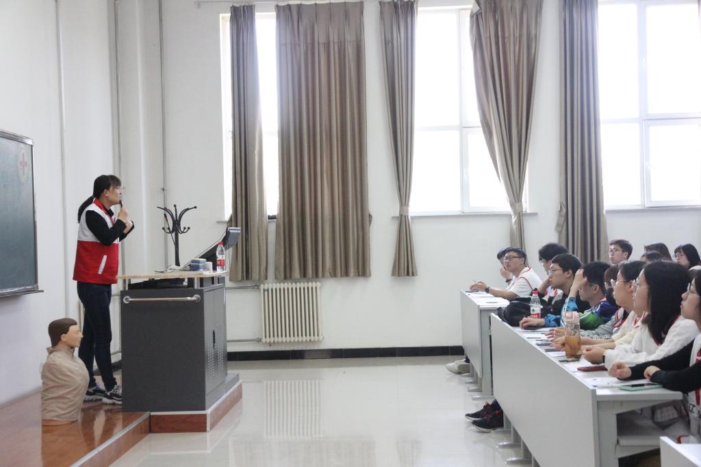 理论培训由本溪红十字会翟老师主讲,翟老师在讲台上声情并茂地为同学们介绍现场应急救护、成人心肺复苏等理论知识。在理论课程上,翟老师还亲身示范,并让学生们在讲台前进行心肺复苏的实践教学。翟老师的教学生动有趣,同学们听讲也十分认真,课堂氛围积极融洽。