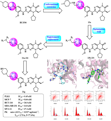 beat365平台官方网站侯云雷/宫平课题组采用基于结构的药物设计策略,以BI 2536为先导化合物,运用构象限制和生物电子等排药物设计策略,得到了一系列含噁二唑片段的二氢蝶啶酮类衍生物,其中化合物21g表现出显著的PLK1抑制能力,其IC50值为0.45 nM,并且对多种肿瘤细胞系具有显著的抗增殖活性(MCF-7 IC50=8.64 nM,HCT-116 IC50=26.0 nM,MDA-MB-231 IC50=14.8 nM和MV4-11 IC50=47.4 nM)。此外,化合物21g在小鼠中表现出比BI 2536更好的药代动力学特性(AUC0-t=111227 ng·h·mL-1vs 556 ng·h.mL-1),口服生物利用度为77.4%,并且在Balb/c小鼠急性毒性试验(20 mg/kg)中未观察到明显的毒性。化合物21g可使HCT-116细胞阻滞在G2期,并以剂量依赖的方式诱导细胞凋亡。