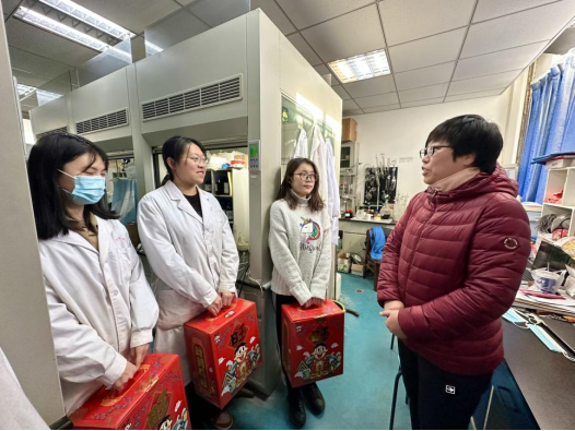 1月18日上午,李哲一行来到留校同学们的实验室及寝室走访看望、座谈畅聊,与同学们进行面对面交流。李哲与留校学生聊学业、话家常,了解他们的家庭情况、留校期间科研与生活情况,叮嘱同学们要严格遵守学校各项规章制度,做好个人防护,注意人身安全和身体健康,安全实验,在学校过个平安吉祥年。老师们还为留校同学亲手送上学院精心准备的新年礼包、水果与贺卡,为同学们送去家一般的温暖。