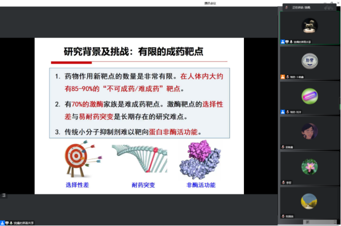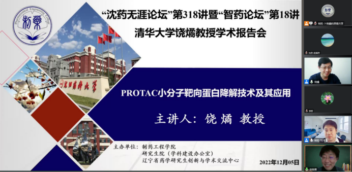 2022年12月5日下午,beat365平台官方网站、研究生院、辽宁省药学研究生创新与学术交流中心联合举办了“沈药无涯论坛”第318讲暨“智药论坛”第18讲,清华大学饶燏教授作了题为“PROTAC小分子靶向蛋白降解技术及其应用”的报告。会议由制药工程学科副主席刘洋教授主持,学院领导班子成员、研究生导师和研究生近300余人参会。