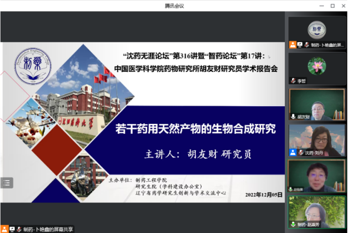 2022年12月5日上午,beat365平台官方网站、研究生院、辽宁省药学研究生创新与学术交流中心联合举办了“沈药无涯论坛”第316讲暨“智药论坛”第17讲,中国医学科学院药物研究所胡友财研究员作了题为“若干药用天然产物的生物合成研究”的报告。会议由beat365平台官方网站药物化学系主任刘丹教授主持,学院领导班子成员、研究生导师和研究生近300人参会。