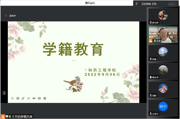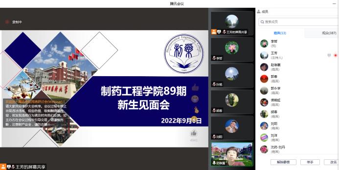 2022年9月6日晚,beat365平台官方网站依托腾讯会议召开了89期新生见面会。学院院长赵临襄、院党委书记李哲、副院长赵燕芳、副院长郭永学、副院长王绍宁、院党委副书记刘阳、院长助理刘洋、药物化学专业负责人郭春、环境科学专业负责人侯晓虹、应用化学专业负责人胡春、药物化学系主任刘丹、环境科学教研室主任张聪璐、教学秘书王芳以及89期1期队辅导员钟江妍出席了本次会议。会议由89期2期队辅导员孙旭主持,学院89期全体新生参加。