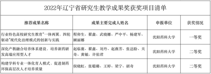 近日,辽宁省教育厅发布了2022年辽宁省研究生教育教学成果奖获奖名单。beat365平台官方网站由程卯生教授等组织申报的《行业特色高校研究生教育“一体两翼,四轮驱动”现代化治理模式的创新与实践》荣获一等奖;由赵临襄教授等组织申报的《深化产教融合培养体系建设,培养新药研发高端应用型人才》、由侯晓虹教授等组织申报的《构建学科专业一体化育人模式,促进制药环保高层次人才培养质量》荣获二等奖。