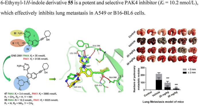 beat365平台官方网站程卯生教授团队在X射线结晶学和结构优化的指导下,通过对先导化合物进行多轮结构优化,得到了一系列3-取代-6-取代乙炔基-1H-吲哚类化合物。作为II类PAKs抑制剂,该系列化合物对PAK4蛋白激酶具有显著的抑制活性和特异性。其中,化合物55对肺癌细胞株A549和黑色素瘤细胞株B16在2.5μM浓度下的迁移抑制率大于40%和60%,优于阳性对照GNE-2861,表现出优异的抗迁移和抗侵袭性能;体内药动实验表明,化合物55在小鼠体内具有适中的半衰期与代谢速率;在裸鼠A549和B16-BL6移植瘤肺转移模型中,化合物55对肺表面转移结节的抑制率分别超过80%和90%。机制研究表明,化合物55减轻转化生长因子-β1诱导的上皮-间充质转化,能够有效抑制肿瘤的迁移、侵袭及转移行为。