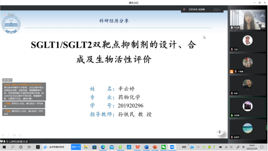 首先辛云婷作了题为“SGLT1/SGLT2双靶点抑制剂的设计、合成及其生物活性评价”的报告,从创新、筛选、结构改造的视角讲述了抗糖尿病药物的研究进展,分享了如何将计算机辅助药物设计与基础化学研究相结合,从而高效获得创新药物,并对自己的研究成果做了详细的报告。