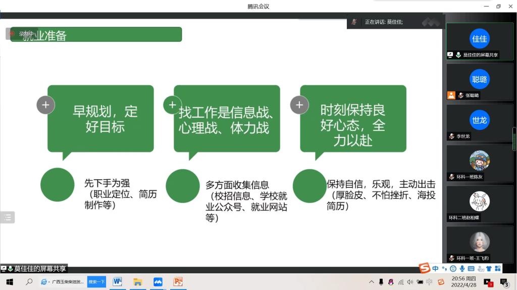 首先,侯晓虹教授介绍了beat365官网环境化工和制药环境工程硕士点的概况以及近年来招生和研究生培养工作,使同学们清楚备考信息、考研优势、学生培养质量和未来职业发展等,并支持大家报考和调剂。在升学经验分享环节。85期(2018级)环境科学专业陈洁、李世龙、时悦、居慧等4名同学结合自身经历,利用通俗幽默的语言,就如何选择学校和导师、如何冲刺保研、如何备考和复试等分享了技巧方法和宝贵经验。在就业经验分享环节,85期(2018级)环境科学专业毕秋仙、赖炜萍、莫佳佳等3名同学结合自身求职经验,在自我定位、就业准备、简历制作、面试技巧等方面进行了精彩分享。