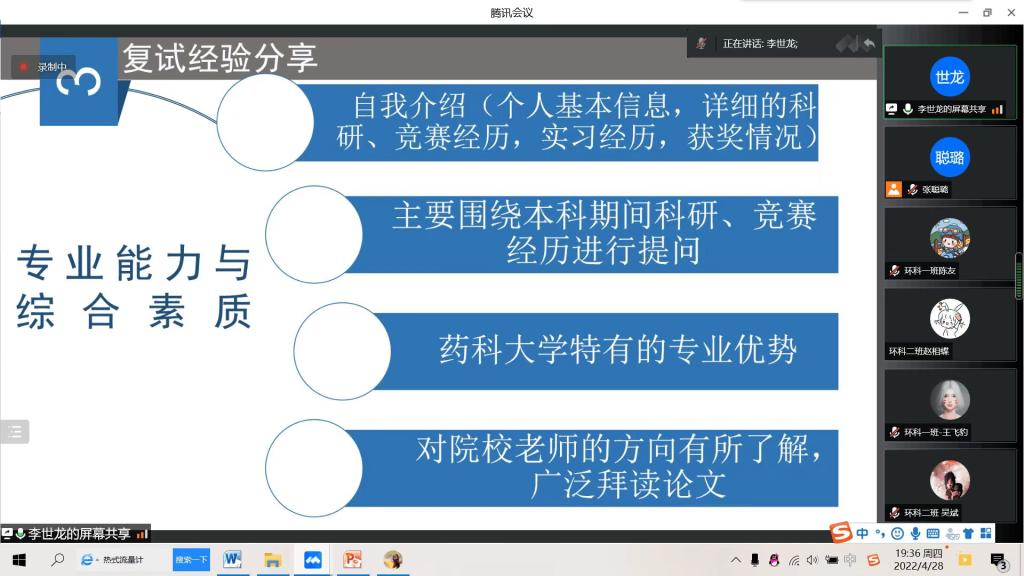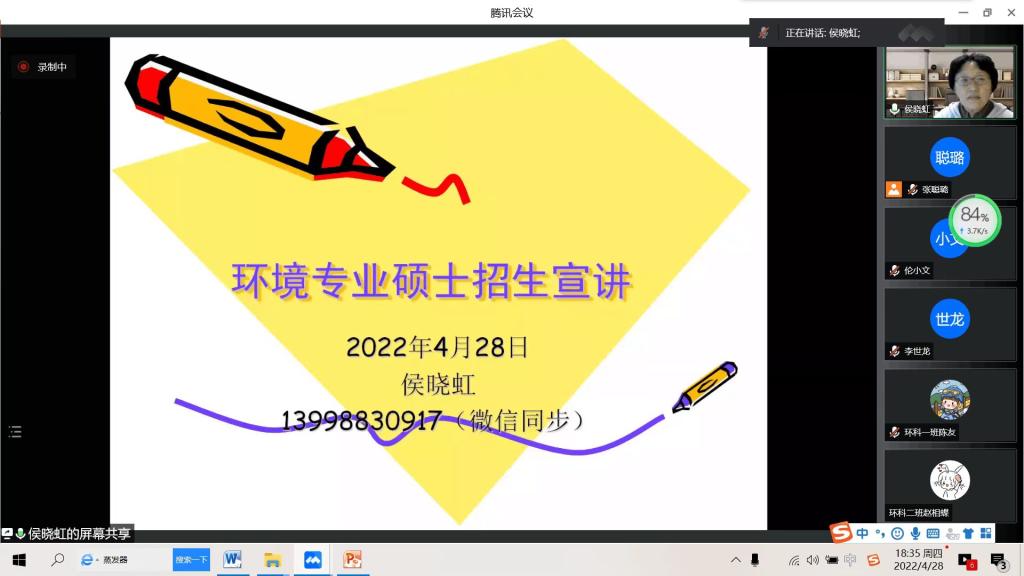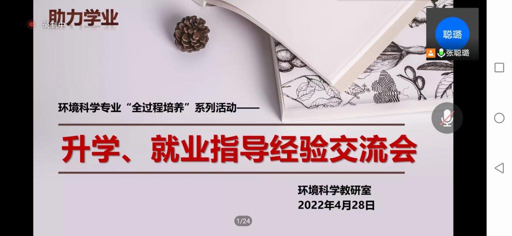 4月28日晚,beat365平台官方网站环境科学教研室在线上举办了一年一度的环境科学专业升学、就业指导经验交流会。本次会议邀请了beat365官网环境科学专业负责人、化学工程与技术学科主席侯晓虹教授做beat365官网环境相关硕士专业介绍,同时邀请85期(2018级)7名保研、考研和就业的优秀学生代表做升学和就业的经验分享。环境科学专业大一至大三的学生、环境科学教研室全体教师共130余人参加了此次分享会。会议由环境科学教研室主任张聪璐主持。