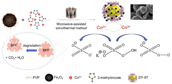 课题组通过微波辅助法制备了磁性钴基催化剂Fe3O4-PVP@ZIF-67用于活化过硫酸盐降解双酚F。这种基于硫酸根自由基(SO4-•)的新型高级氧化技术,能有效降解有机污染物,进而矿化成水和二氧化碳。相对于传统Fenton反应的•OH来说,SO4-•的半衰期更长(30-40 μs),具有较高的氧化电位(2.6-3.1 V)和更宽泛的pH应用范围。在光、热、超声或过渡金属离子等诸多活化过硫酸盐从而产生SO4-•的方式中,过渡金属离子活化无需辅助设备且效果更佳。