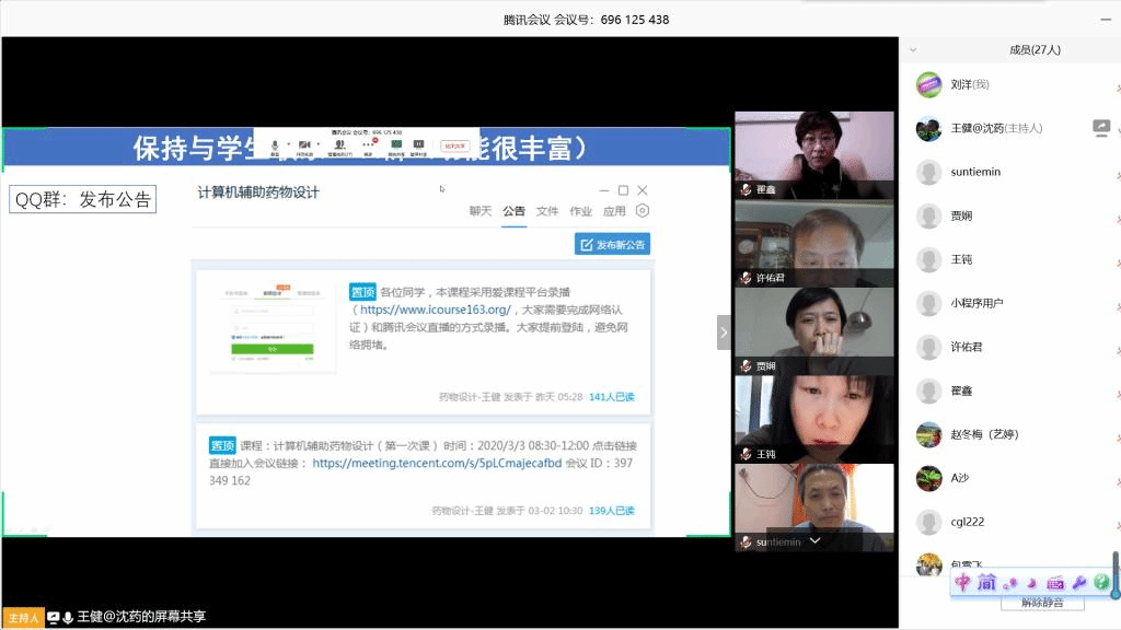 在组织全体教师进行线上授课教学的讨论后,由已经开展线上教学并取得较好教学效果的王健老师分享线上教学的相关经验。他结合自己联合使用爱课程平台+腾讯会议+QQ群+EV录屏等应用软件,开展直播授课的经验,介绍了线上教学中各种平台软件的使用技巧,强调与学生保持时时沟通对保证教学质量的必要性。随后,全体教师就直播授课、在线答疑、作业考核、师生互动等内容进行了交流。部分老师还提出了自己在准备线上教学过程中遇到的问题,多位老师及时予以解答或推荐解决办法。此外,对教研室负责的多门实验课程的教学手段和时间安排,也进行了相应的讨论。