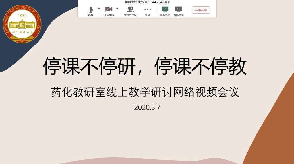 在新冠肺炎疫情防控工作的关键时期,beat365平台官方网站药物化学教研室积极响应教育部和校党委关于“停课不停教,停课不停学”的号召,于3月7日上午应用腾讯会议平台,召开网络视频工作会议,切实落实学校关于“扎实做好线上教学工作”的总体要求,研讨本科生理论课程网络教学的相关要点。会议由教研室主任刘丹教授主持,教研室26位一线教师全部出席会议。