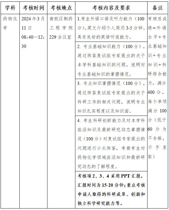 考核内容包括外语水平、专业基础知识、专业知识和科研综合能力四个模块,每个单项满分为100分,成绩低于60分为考核不合格不予录取。