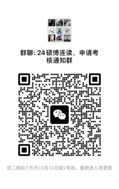 原则上采用现场考核方式,如考生因特殊原因无法到达现场,需要提前跟学院研究生招生领导小组申请,通过网络参加考核。请所有参加考核的人员扫码加群,分组情况后续在群中通知。