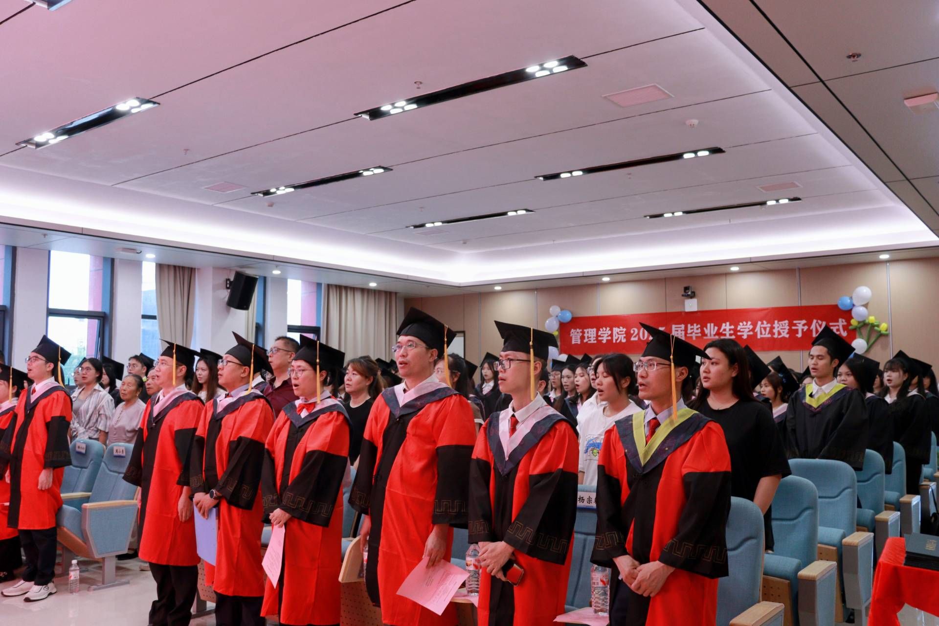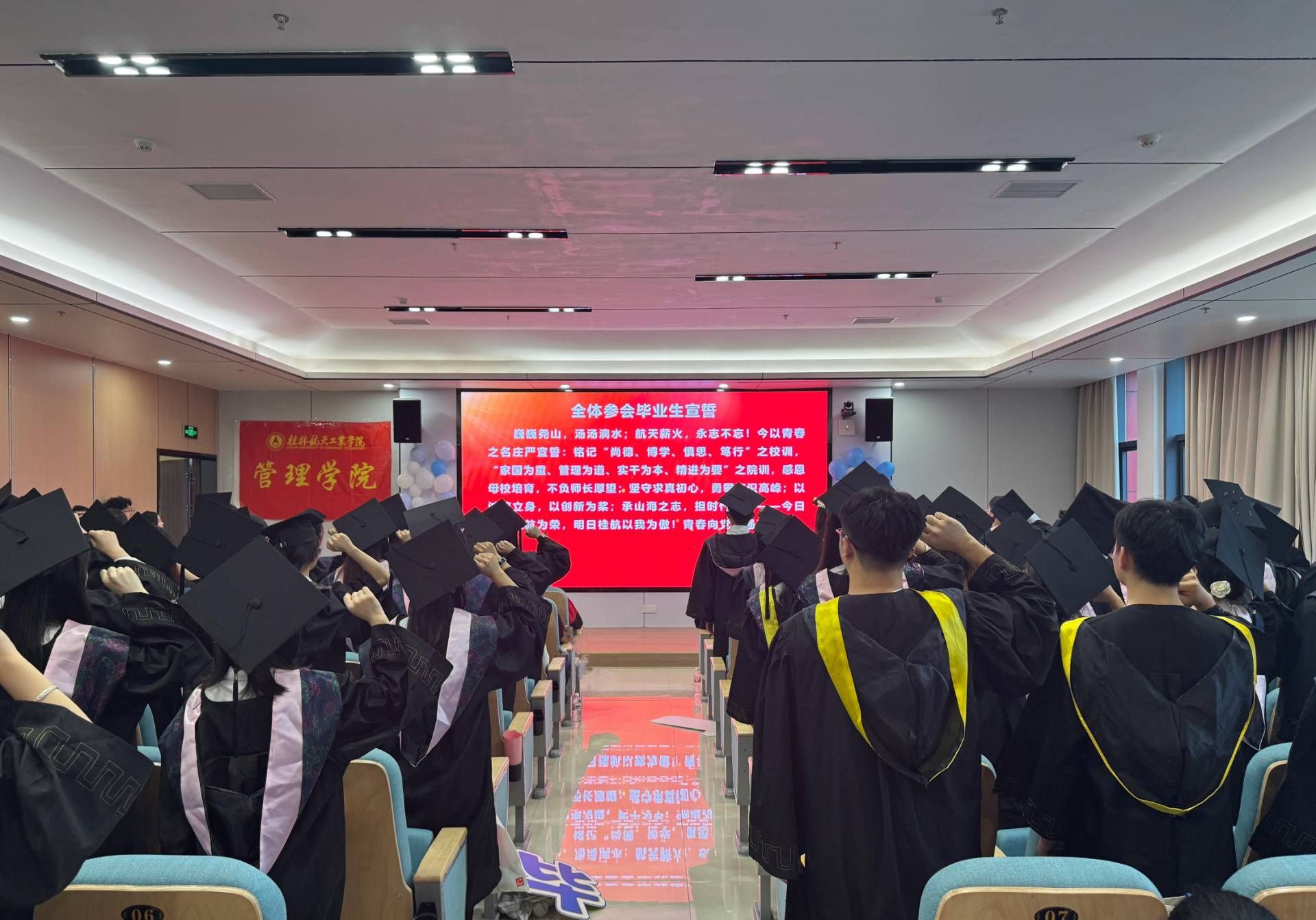铮铮誓言,青春宣言。典礼现场,毕业生们以铿锵誓言回应母校期许:“铭记校训院训......感恩母校培育......坚守求真初心......承山海之志,担时代之责......青春向党,强国有我!”誓言响彻大厅,彰显了新时代青年的使命担当。