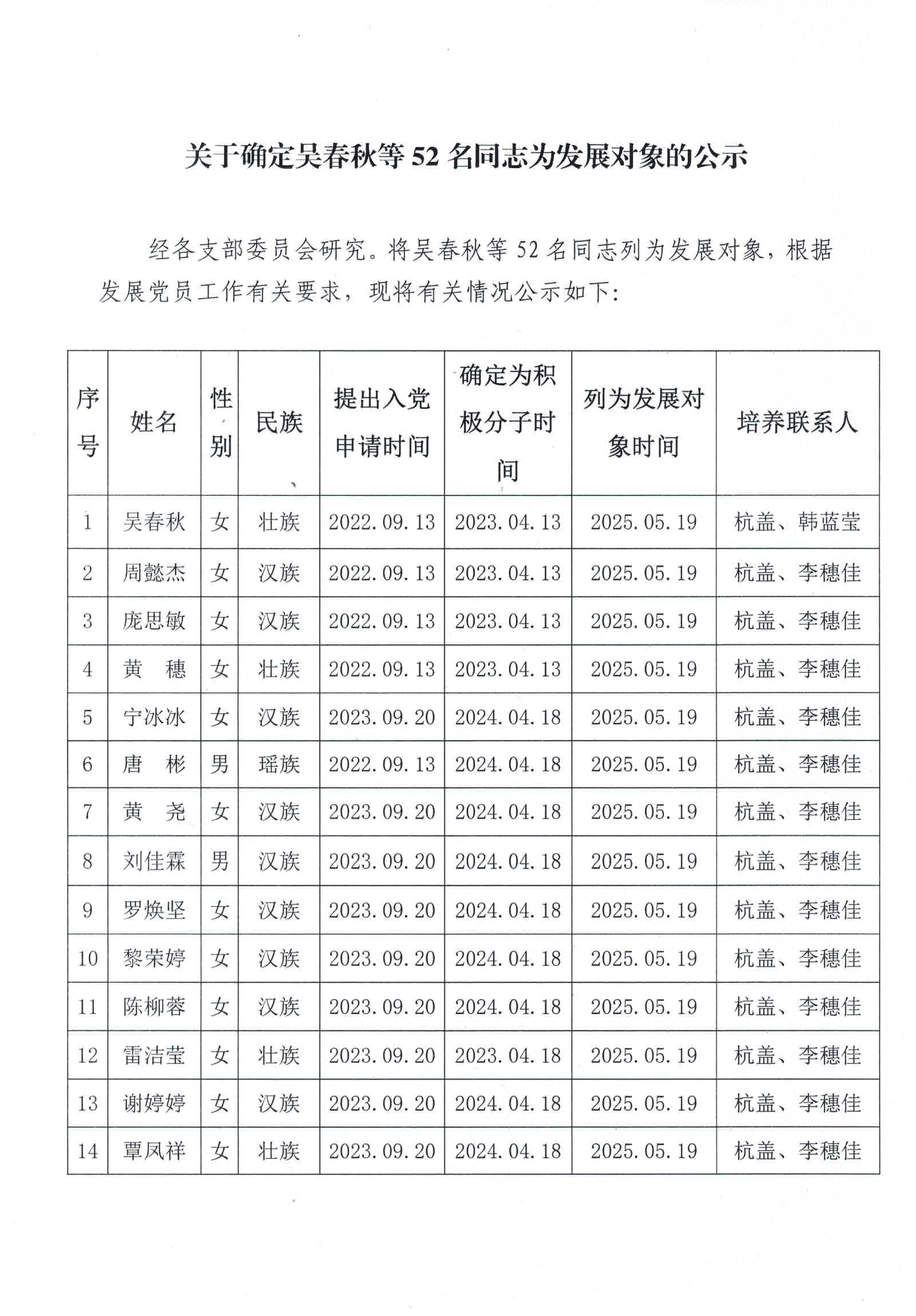 关于确定吴春秋等52名同志为发展对象的公示
