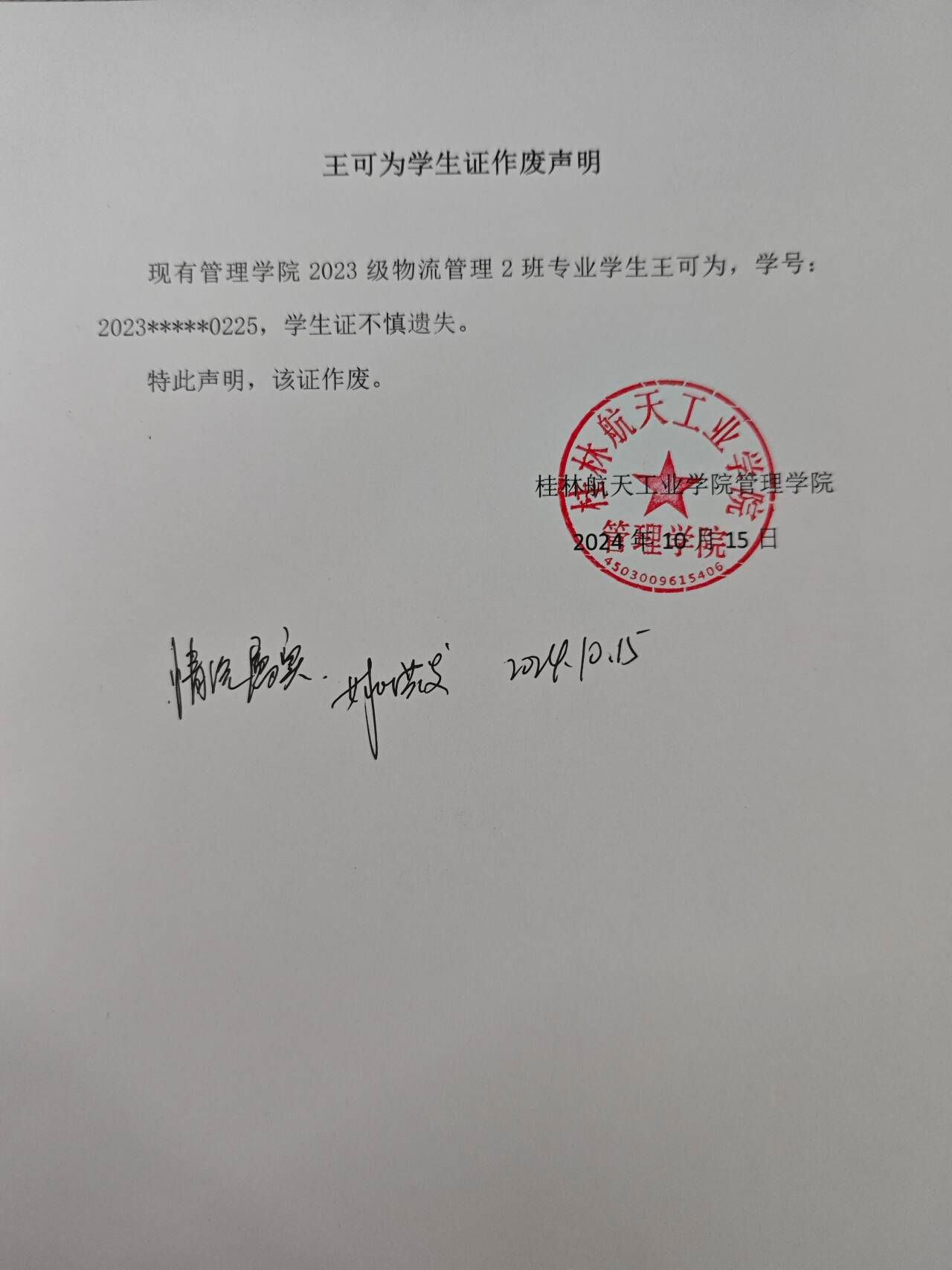 王可为学生证作废声明