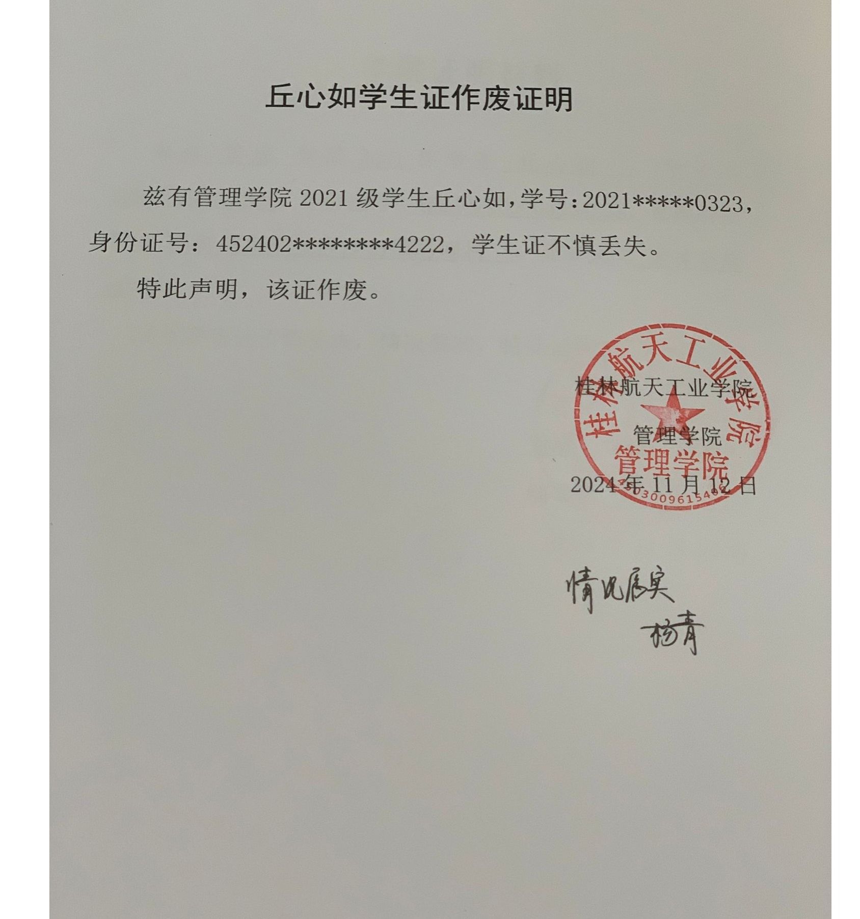 丘心如学生证作废声明