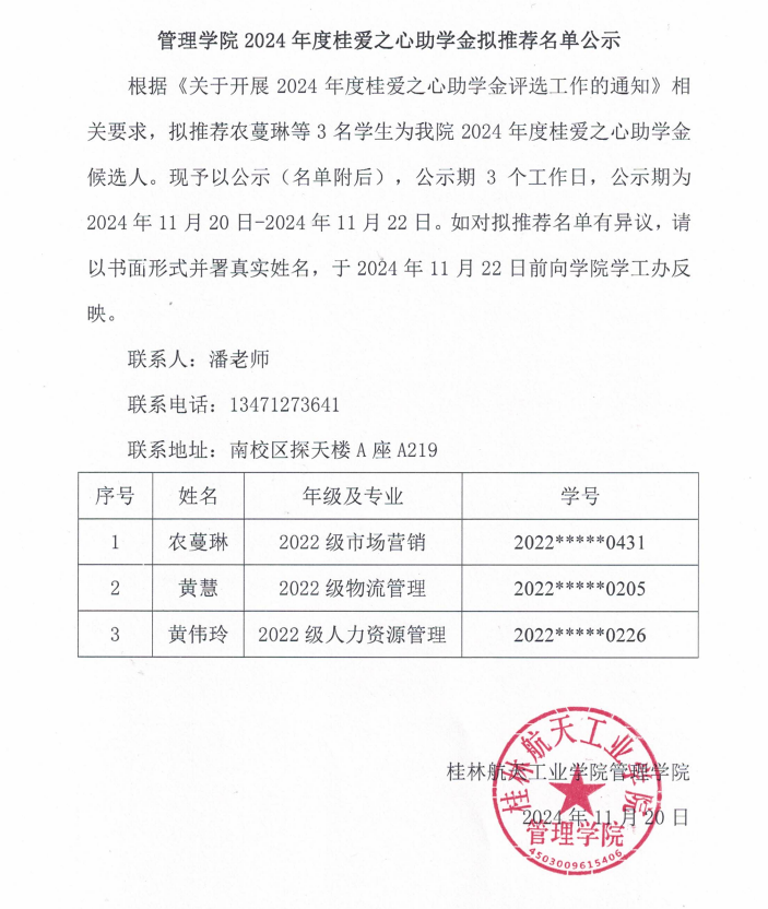 根据《关于开展2024年度桂爱之心助学金评选工作的通知》相关要求,拟推荐农蔓琳等3名学生为我院2024年度桂爱之心助学金候选人。现予以公示(名单附后),公示期3个工作日,公示期为2024年11月20日-2024年11月22日。如对拟推荐名单有异议,请以书面形式并署真实姓名,于2024年11月22日前向学院学工办反映。