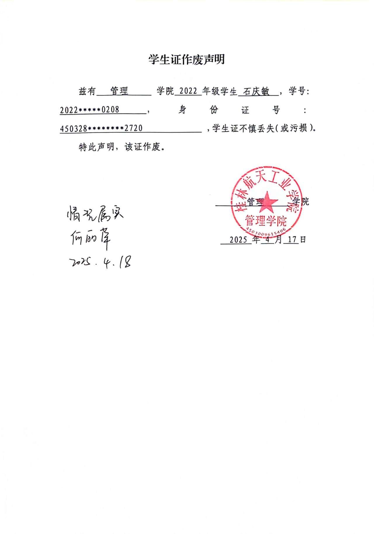 石庆敏学生证作废声明