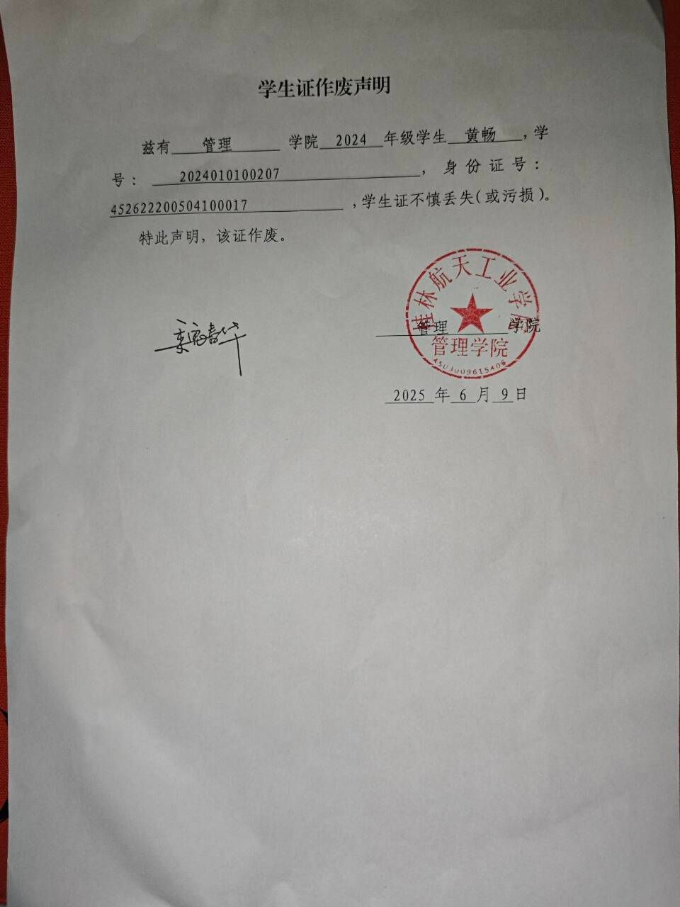 黄畅学生证作废声明