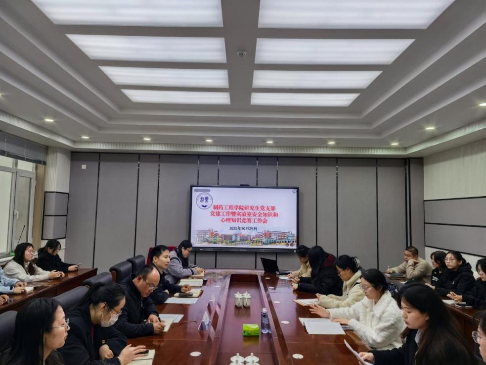 为深入推进党建工作与学科特色、学生培养深度融合,以党建引领实验室安全管理提质、心理健康教育增效,10月 29日下午,beat365平台官方网站研究生党支部在制药楼227室召开党建工作部署会暨实验室安全知识与心理知识竞答工作会。学院党委书记王中华出席并讲话,党委副书记刘鹏程主持会议。学院组织员仲恒、丛璐,研究生辅导员钟梓俊、盛志成、刘薇薇以及各研究生党支部学生代表参会。